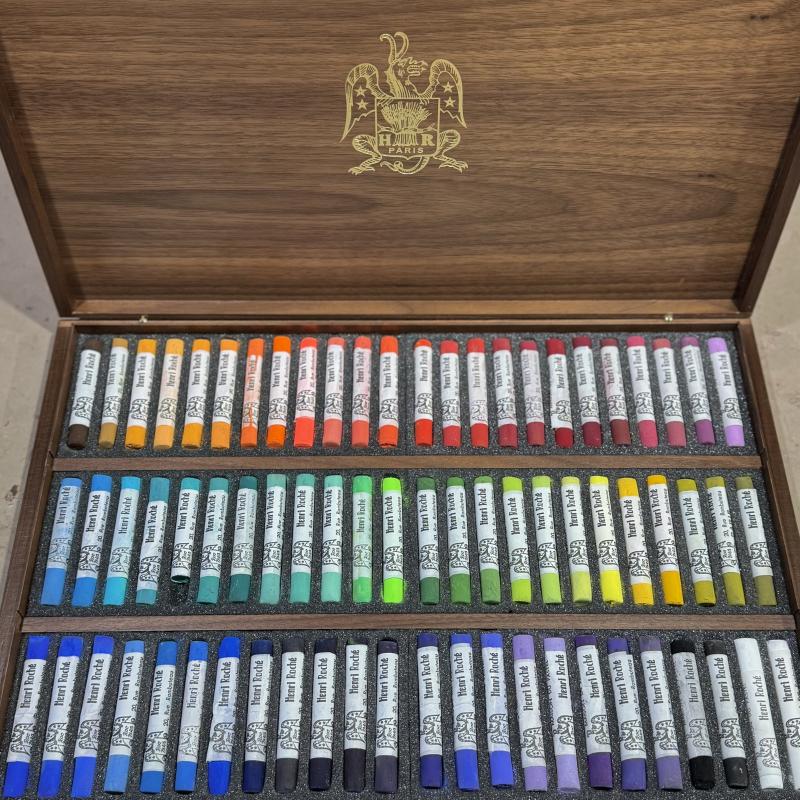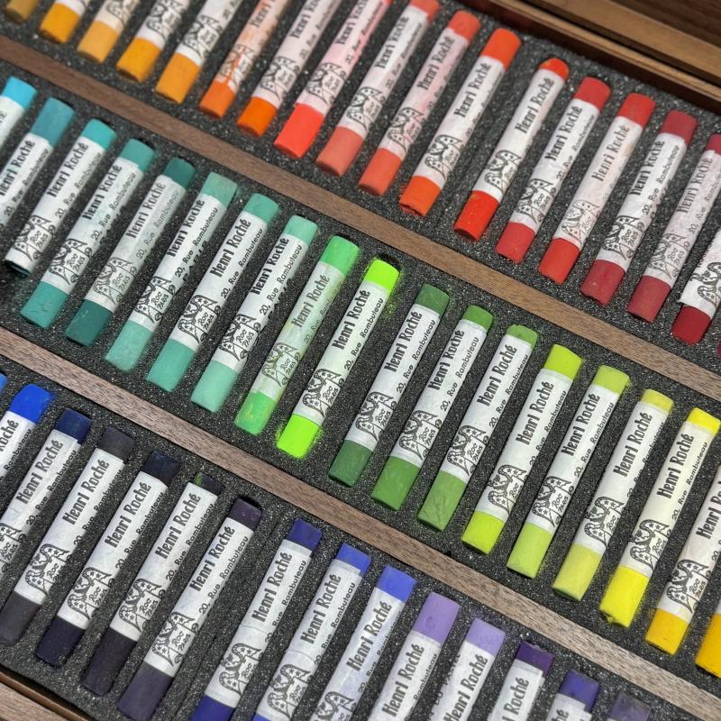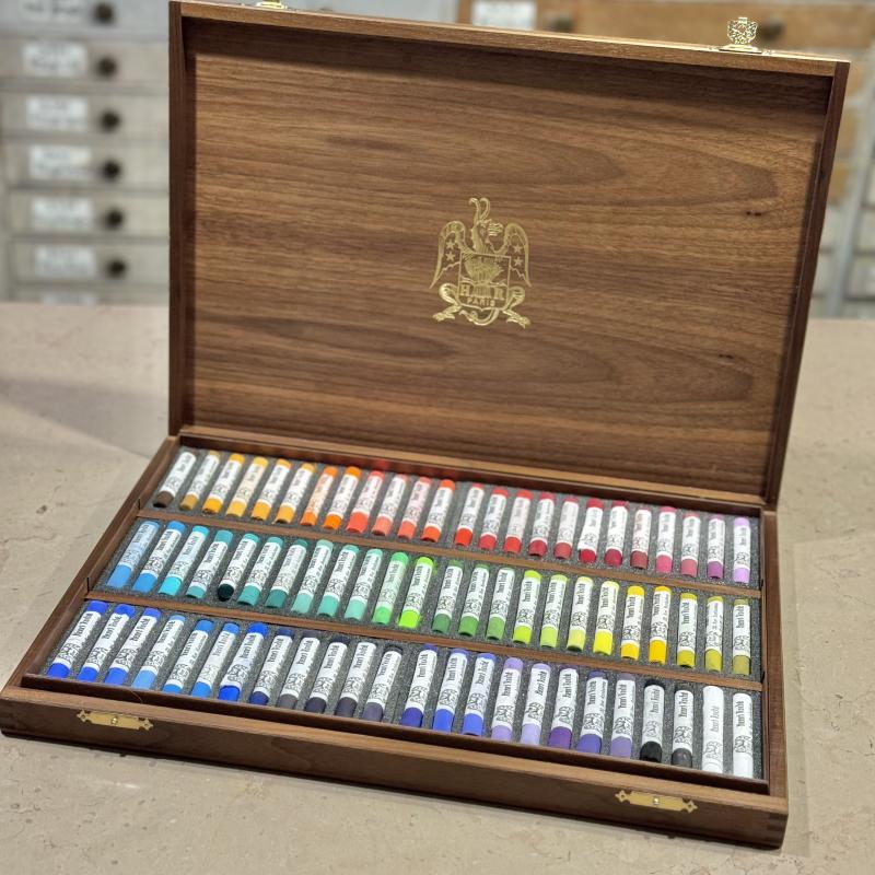 This assortment consists of pastels either dating from the 1960s through the mid 2000s that are no longer in our official range (old or slightly different fabrications,) or recent fabrications accidentally broken in two. They are offered with a 40% reduction in price and presented in a luxury walnut box. Web exclusive. (For availability in Paris, please contact us in advance.)
