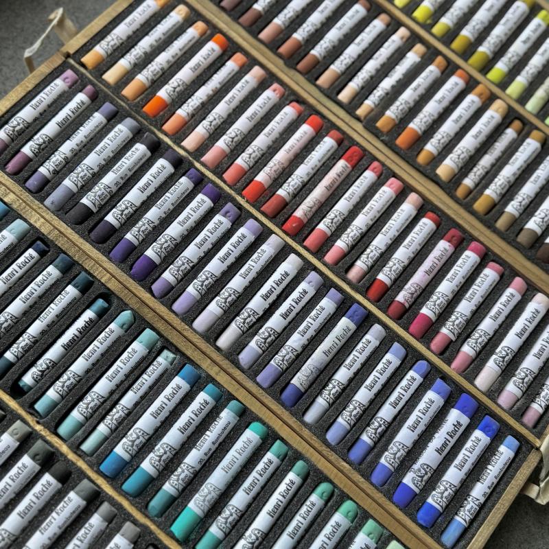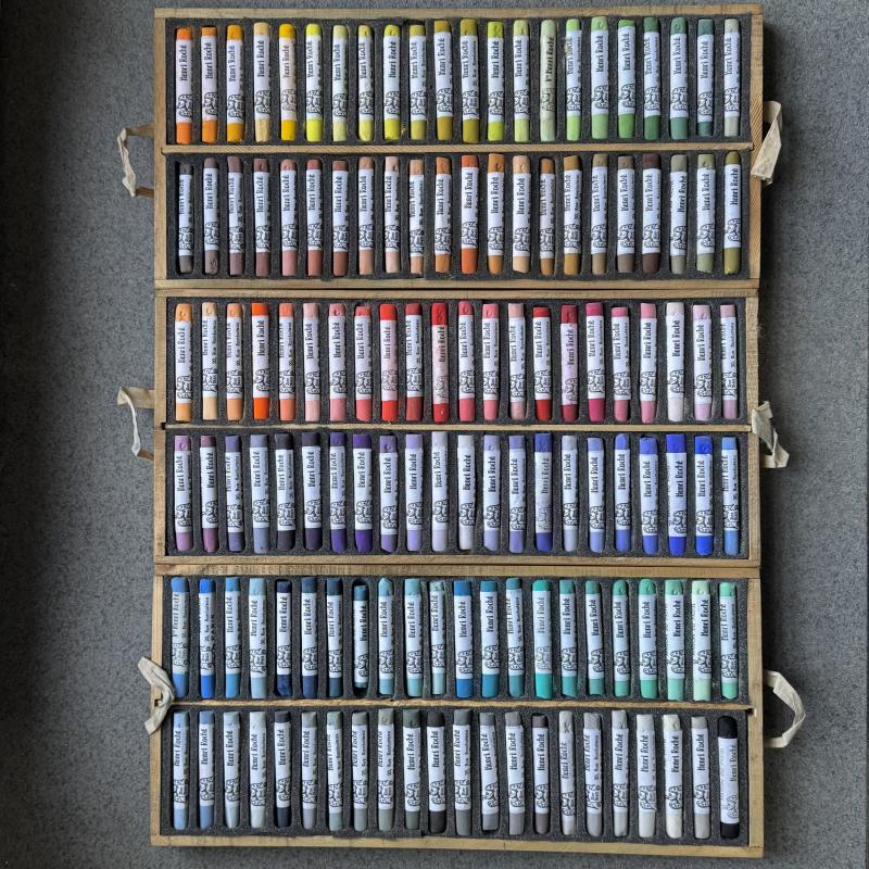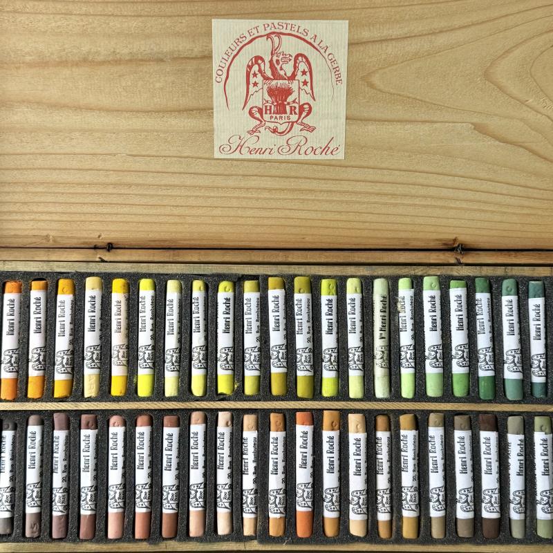 This assortment consists of pastels dating from the 1960s through the mid 2000s, that are no longer in our official range (old or slightly different fabrications,) offered with a 35% reduction in price. They are presented in a rustic, well-loved wooden box from the mid 20th century. Web exclusive.