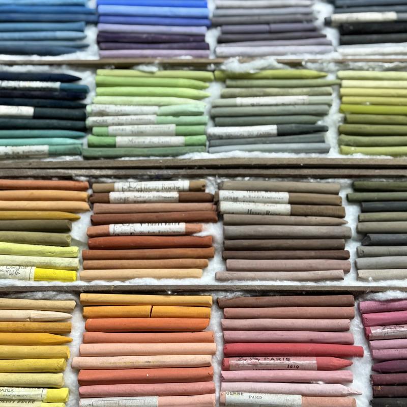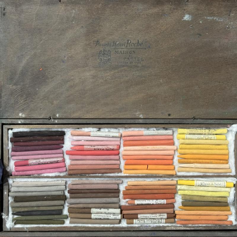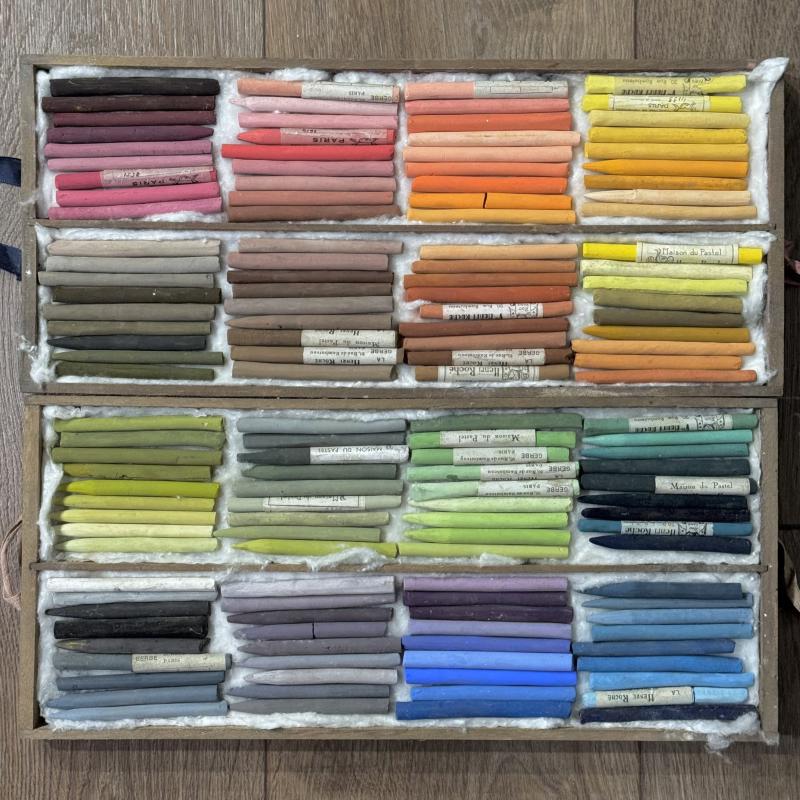 A uniquely significant collection of antique semi-hard pastels. These handmade colors from the late 19th/early 20th century have characteristics similar to Roché soft pastels, but are firmer in texture in order to render finer lines. They are presented in a historically appropriate box from the early 20th century. Web exclusive.