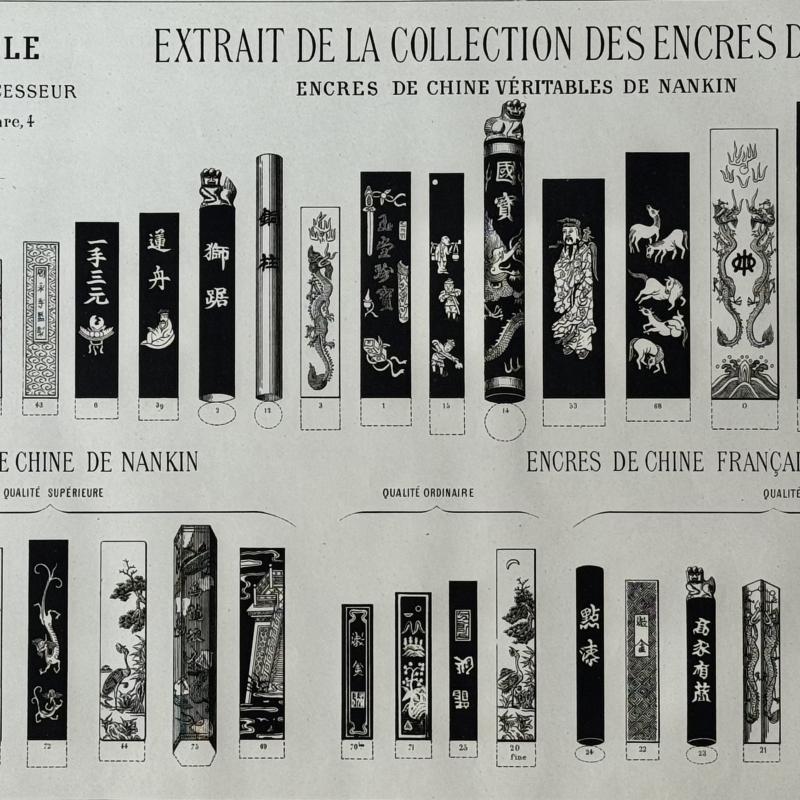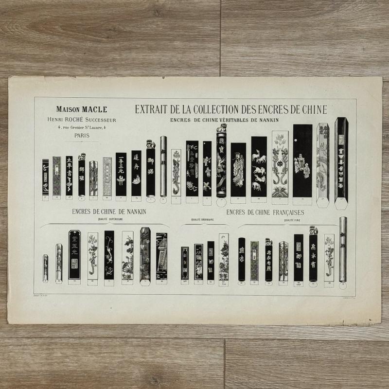 An antique lithograph on delicate paper depicting China ink sticks sold and manufactured by the Maison Macle (Henri Roché successor) in the late 19th century. Approx 36.5 cm x 55 cm. Web exclusive, limited quantities available. PLEASE ORDER THIS OBJECT INDEPENDENTLY FROM OTHER OBJECTS ON THIS WEBSITE AS IT REQUIRES A DEDICATED TYPE OF PACKAGING