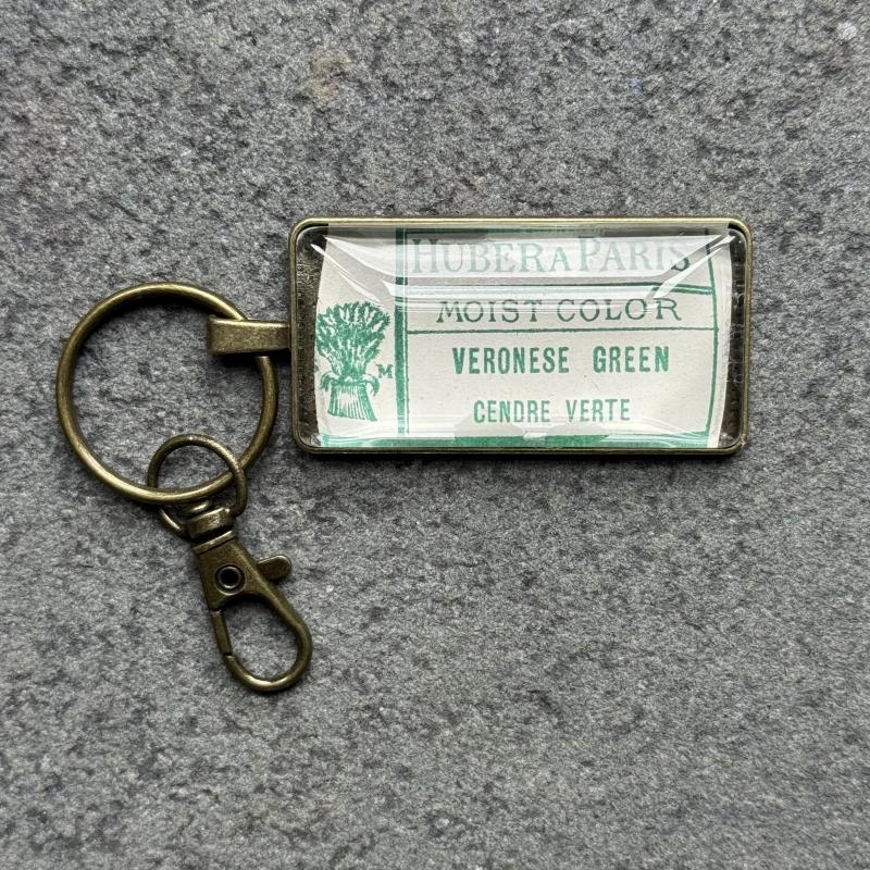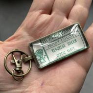 A metal keychain showcasing an antique watercolor label from the late 19th century, protected under glass.